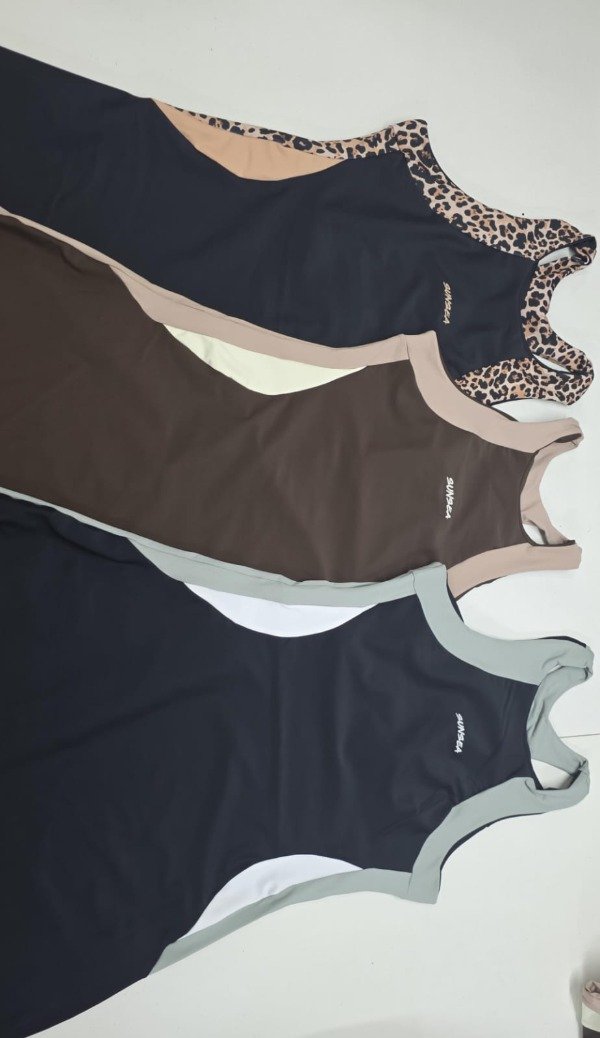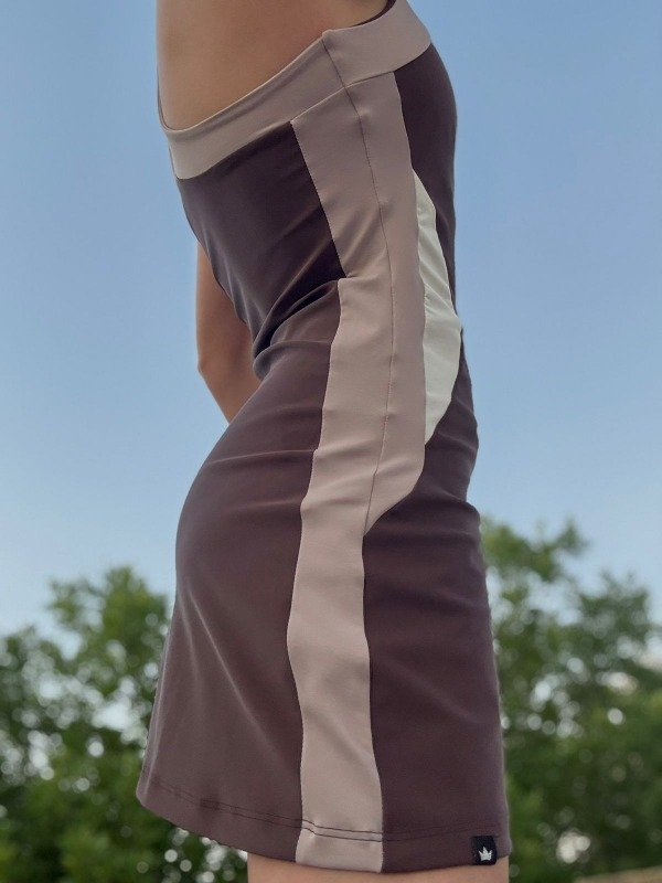 Vestido sin mangas conr ecortes curvos tricolor. Disponible en Negro/Gris/Blanco, Choco/Nude/Natural, y Negro/Nude/Print.