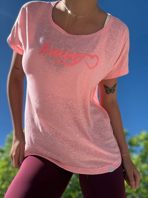 Remeras de algodón estampa Love. Disponibles en color Gris y Salmón Papaya.