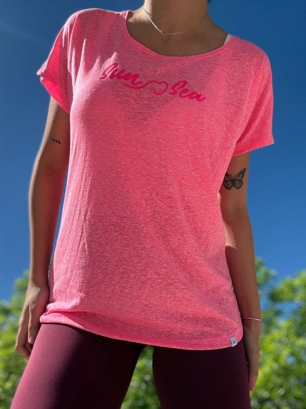 Remeras de algodón estampa Love Sunsea. Disponibles en color Rosa Flúo