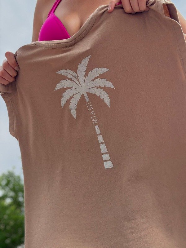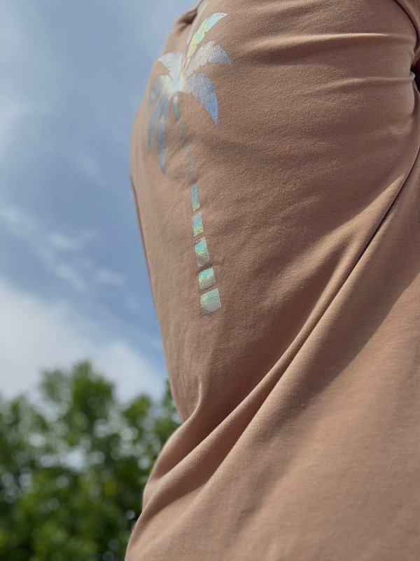Remera Miami estampa Holografica. Color Caramelo y Plata