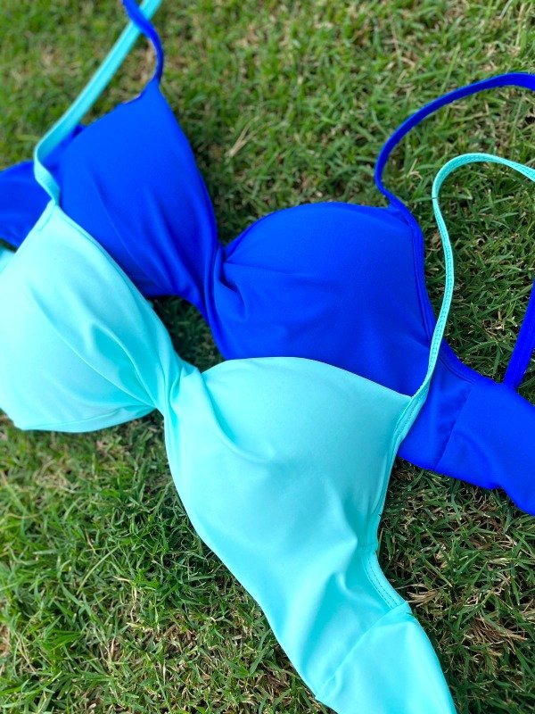 Corpiños con taza. Disponibles en Azul Surf (arriba en la foto) y Verde Aqua (abajo)